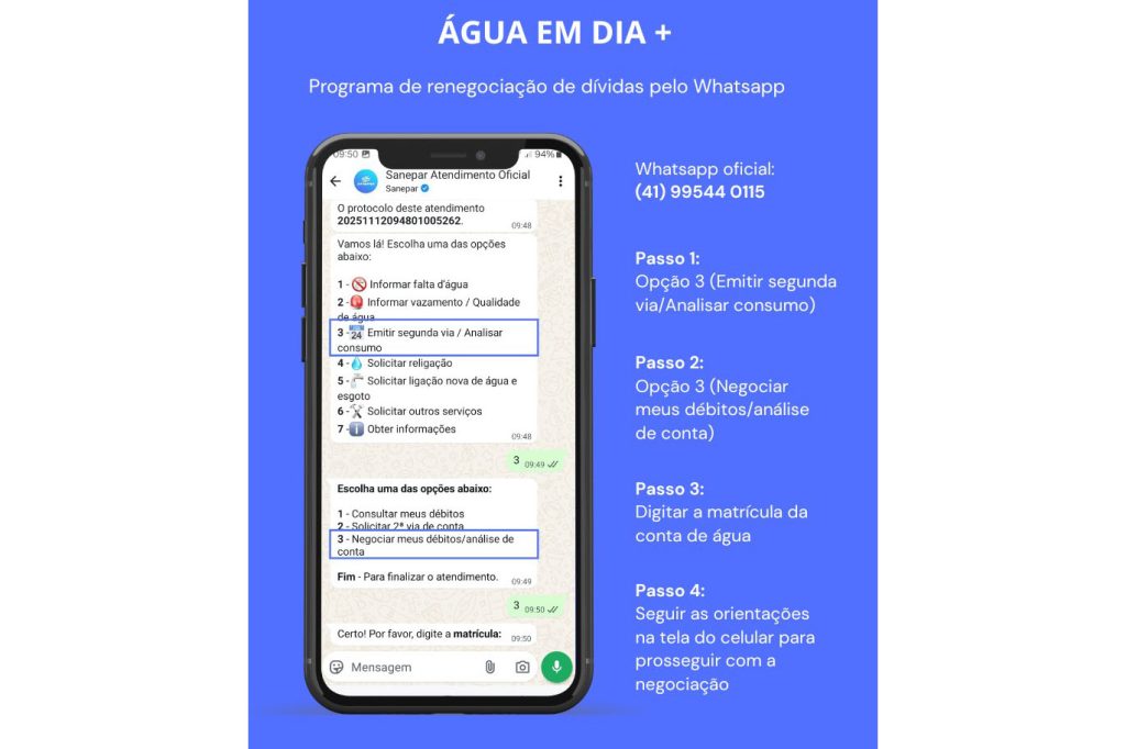 A Companhia de Saneamento do Paraná (Sanepar) lançou o “Água em Dia +”, novo programa que permite aos clientes renegociarem débitos diretamente pelo WhatsApp, sem a necessidade de comparecer a uma central de atendimento. A negociação é feita exclusivamente pelo número oficial da empresa: (41) 99544-0115.