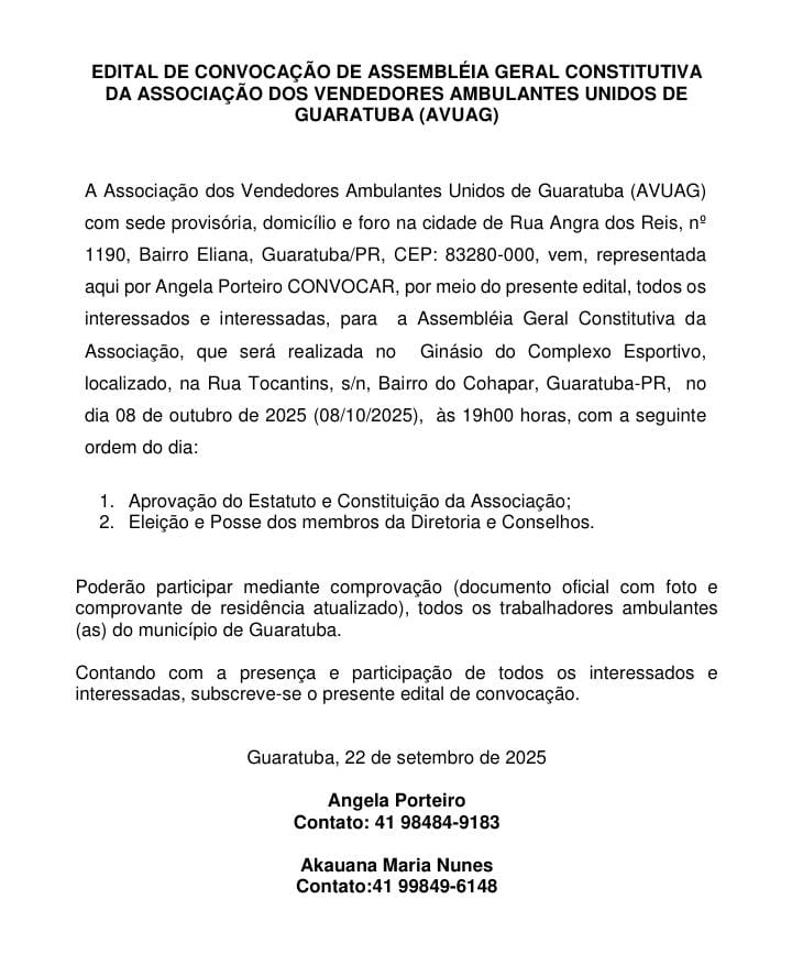 Os vendedores ambulantes de Guaratuba estão se organizando para fortalecer a categoria. A recém-criada Associação dos Vendedores Ambulantes Unidos de Guaratuba (AVUAG) convocou todos os trabalhadores do setor para participar da Assembleia Geral Constitutiva, que acontece no próximo dia 8 de outubro de 2025, às 19 horas, no Ginásio do Complexo Esportivo, localizado na Rua Tocantins, s/n, no bairro Cohapar.