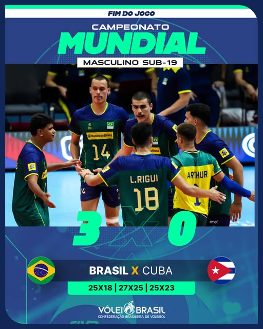 A seleção brasileira masculina sub-19 garantiu a terceira vitória no Mundial da categoria ao derrotar Cuba por 3 sets a 0 (25/18, 27/25 e 25/23), classificando-se para as oitavas de final da competição que está sendo disputada em Tashkent, no Uzbequistão.