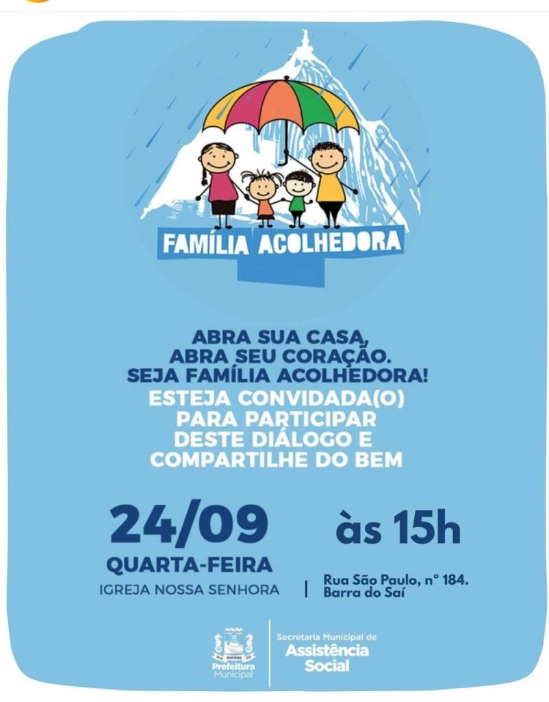Na tarde desta quarta-feira (24), a partir das 15h, será realizado um encontro da Família Acolhedora na Igreja Nossa Senhora dos Navegantes, no bairro Barra do Saí, em Guaratuba.