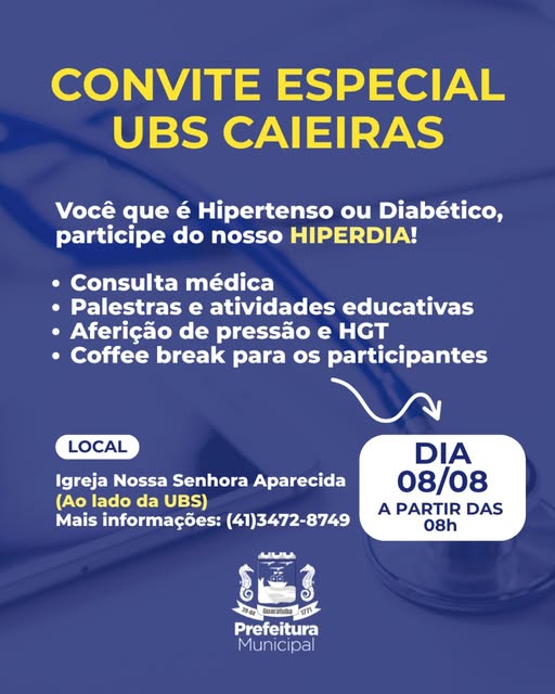 A Secretaria Municipal de Saúde de Guaratuba, por meio da Diretoria das Unidades Básicas de Saúde (UBSs), promove na próxima quinta-feira, 8 de agosto, uma ação especial dedicada à promoção da saúde e prevenção de doenças crônicas. A iniciativa faz parte do “Programa HIPERDIA” e será realizada na região da UBS Caieiras, com foco no atendimento a pessoas com hipertensão arterial e diabetes.