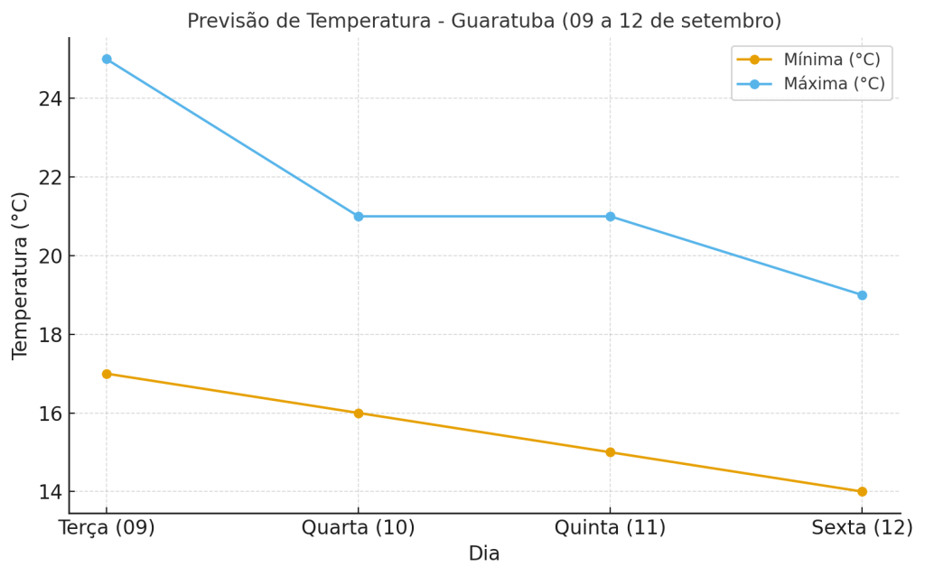 No litoral, a cidade de Guaratuba terá uma mudança brusca no clima. Nesta terça-feira, a mínima será de 17 °C e a máxima de 25 °C, com 91% de chance de chuva pela manhã e tempo firme à noite.