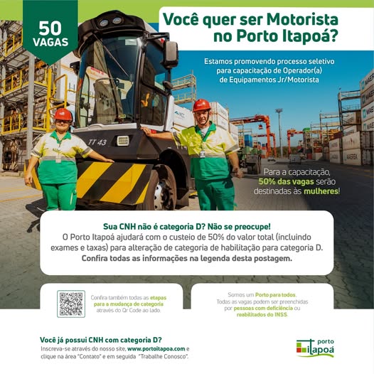 O Porto Itapoá está promovendo um processo seletivo para capacitação de Operador(a) de Equipamentos Jr/Motorista.
