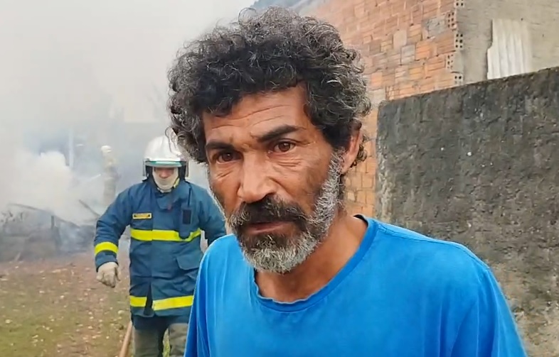 O morador atingido, de camiseta azul, relatou que estava dormindo quando percebeu o início do fogo. Apesar do susto e das perdas materiais, ele não se feriu.
