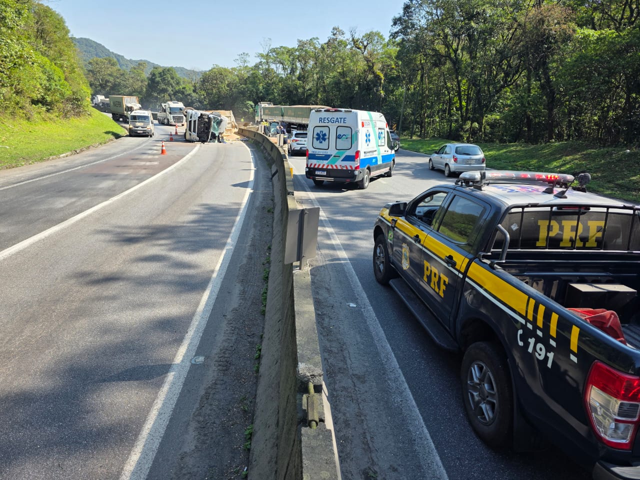 De acordo com a concessionária EPR Litoral Pioneiro, as equipes da empresa e da Polícia Rodoviária Federal (PRF) trabalham na remoção do caminhão e na organização do tráfego. Atualmente, uma faixa permanece bloqueada em cada sentido da rodovia, e ainda não há previsão de liberação total do tráfego.