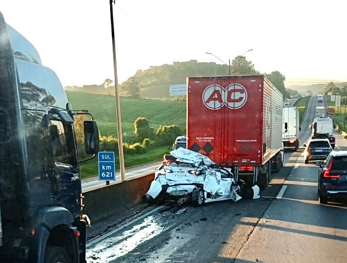 Segundo a concessionária, todas as vítimas estavam no automóvel, que foi prensado entre duas carretas. O acidente ocorreu por volta das 6h, quando os três veículos trafegavam pela faixa da esquerda.
