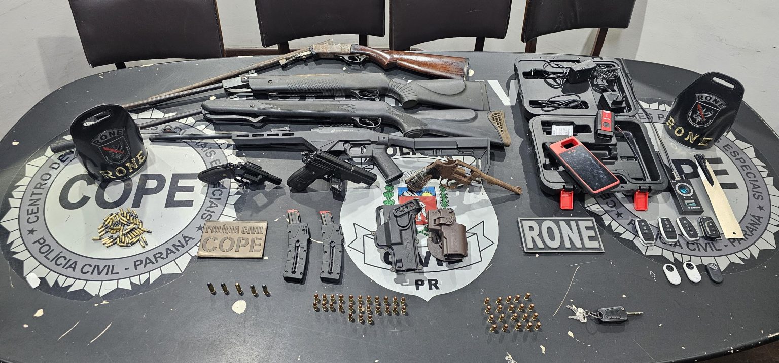 A operação foi realizada de forma conjunta pelo Centro de Operações Policiais Especiais (Cope), unidade de elite da PCPR, e pela Rondas Ostensivas de Natureza Especial (Rone), tropa especializada da PMPR. As equipes localizaram uma chácara na zona rural do município que estaria sendo usada como base de apoio pelo grupo criminoso. No local, foram apreendidas armas de fogo e uma caminhonete com placas adulteradas, possivelmente utilizada na ação criminosa.