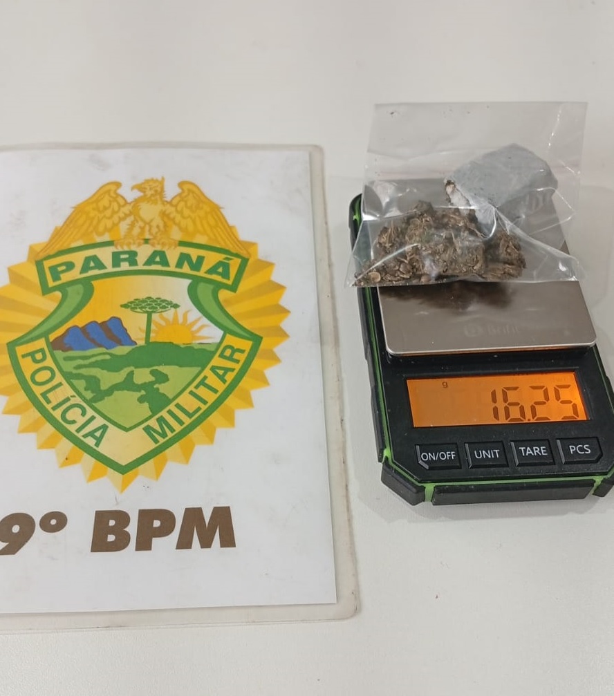 Durante a abordagem, os militares encontraram no bolso da calça do suspeito uma porção de substância análoga à maconha, totalizando 16,5 gramas. Questionado, o homem afirmou ser usuário e disse ter se assustado ao notar a presença da equipe policial.