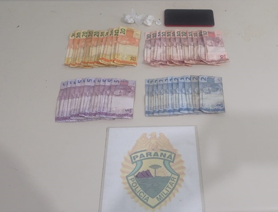 Dentro dela foram encontrados R$ 402 em dinheiro trocado, 25 pedras de crack e 12 porções de cocaína, todas embaladas e prontas para a venda.